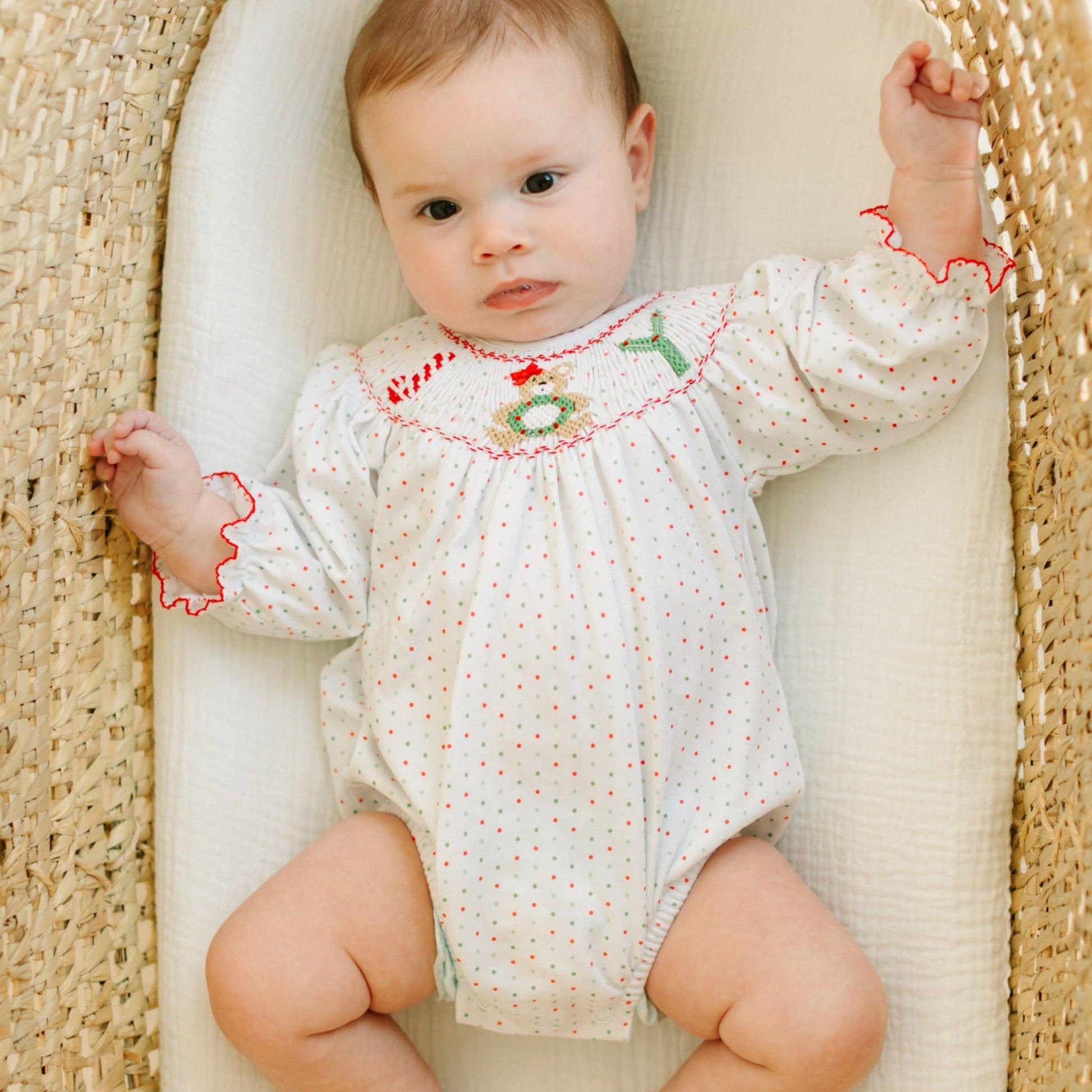* Hand-Embroidered Smocked Pattern: Features a beautiful smocked design with a candy cane, a teddy bear, and a Christmas tree with the word "joy."