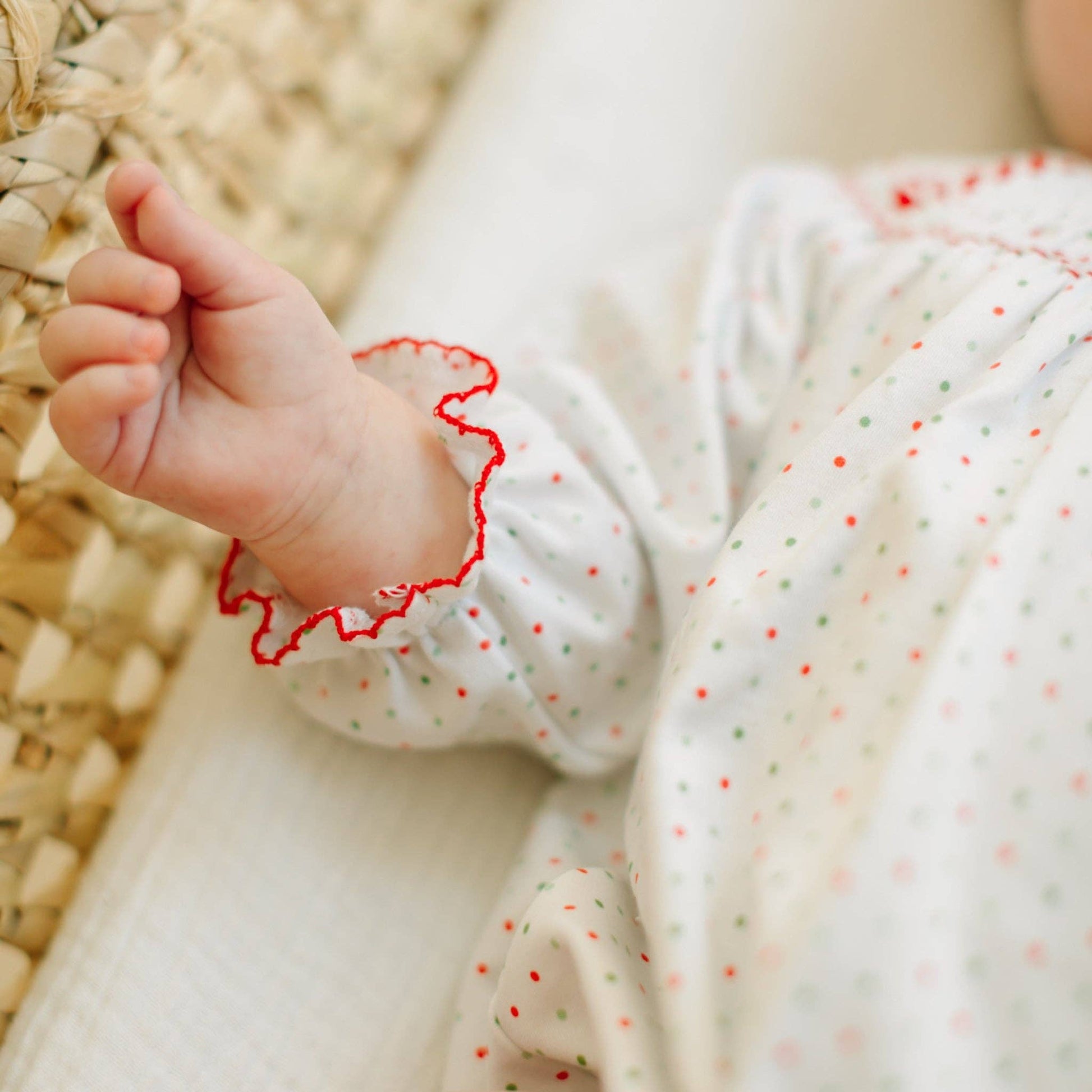 Wrap your little one in timeless holiday elegance with our Christmas Joy Classics Bishop Long Sleeve Bubble - Red. Inspired by a traditional Christmas, this luxurious Pima Cotton one-piece combines classic style with cozy Bishop sleeves, featuring a charming hand-embroidered smocked pattern and festive red picot trim.