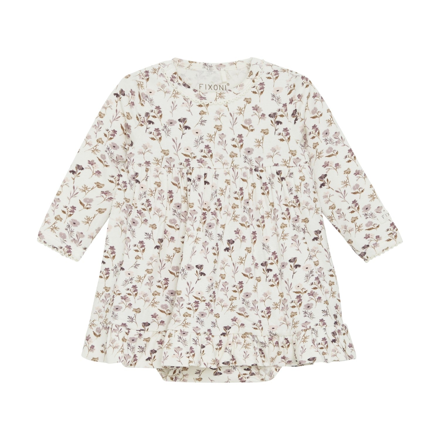 Dress your little one in timeless charm with this FIXONI Baby Long Sleeve Floral Dress . Made from soft, breathable cotton, it features a delicate all-over floral print in muted lilac and beige tones, perfect for both everyday wear and special occasions. The gathered waist adds a gentle flare for a sweet silhouette, while the built-in bodysuit ensures comfort and practicality during play or outings. Finished with subtle ruffle details along the hem and secure snap buttons underneath for easy changing, this dress combines elegance with functionality.