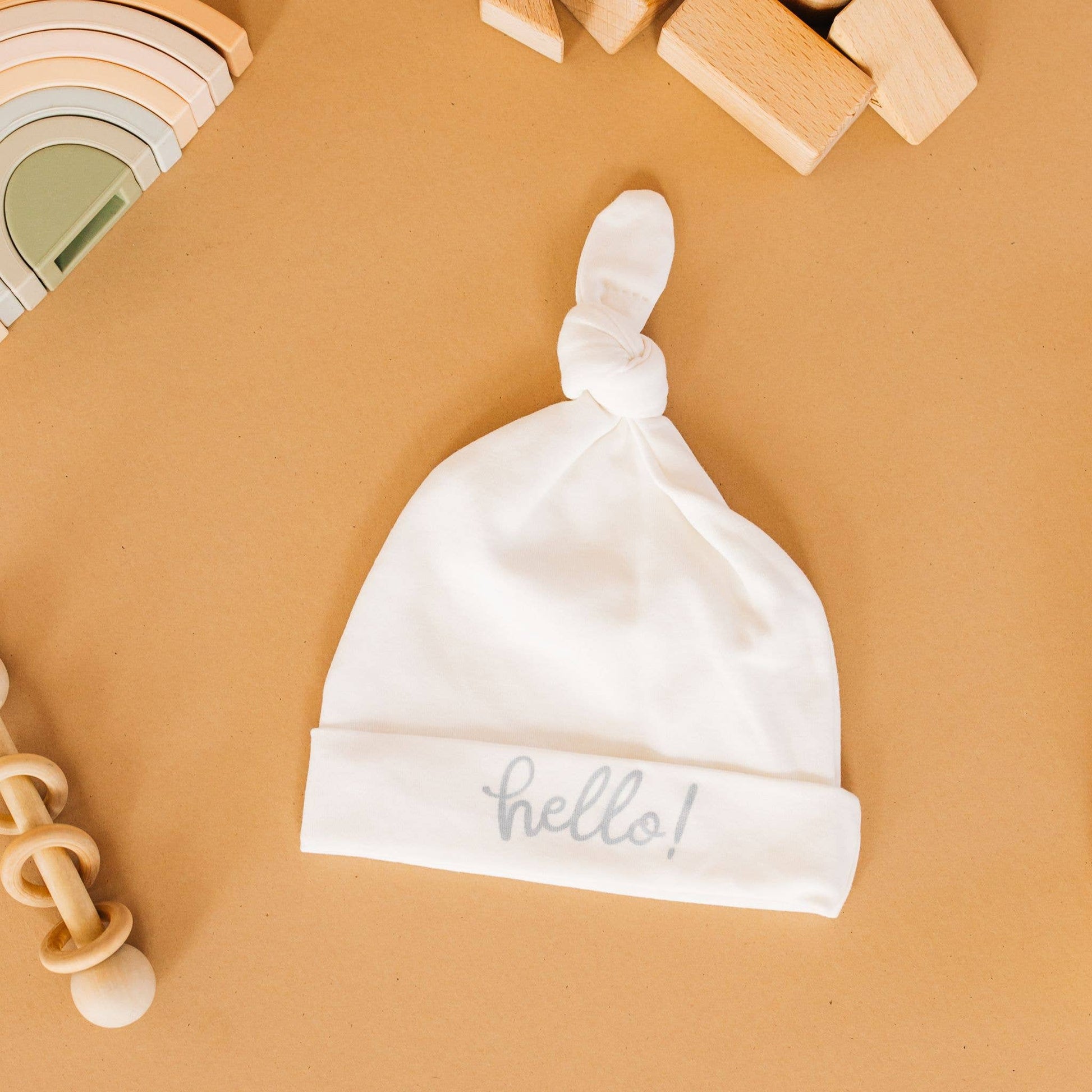 Elevate your newborn essentials assortment with this Ivory Pima Cotton “Hello!” Knotted Hat from Luna & Arlo. Expertly crafted in 100% premium Pima cotton, this baby beanie features a folded cuff printed with a delicate silver “hello!” script and a top knot that can be adjusted as infants grow. The neutral ivory shade, premium fabric, and minimalist calligraphy make it a versatile add-on for registries, gift sets, and year-round seasonal displays.