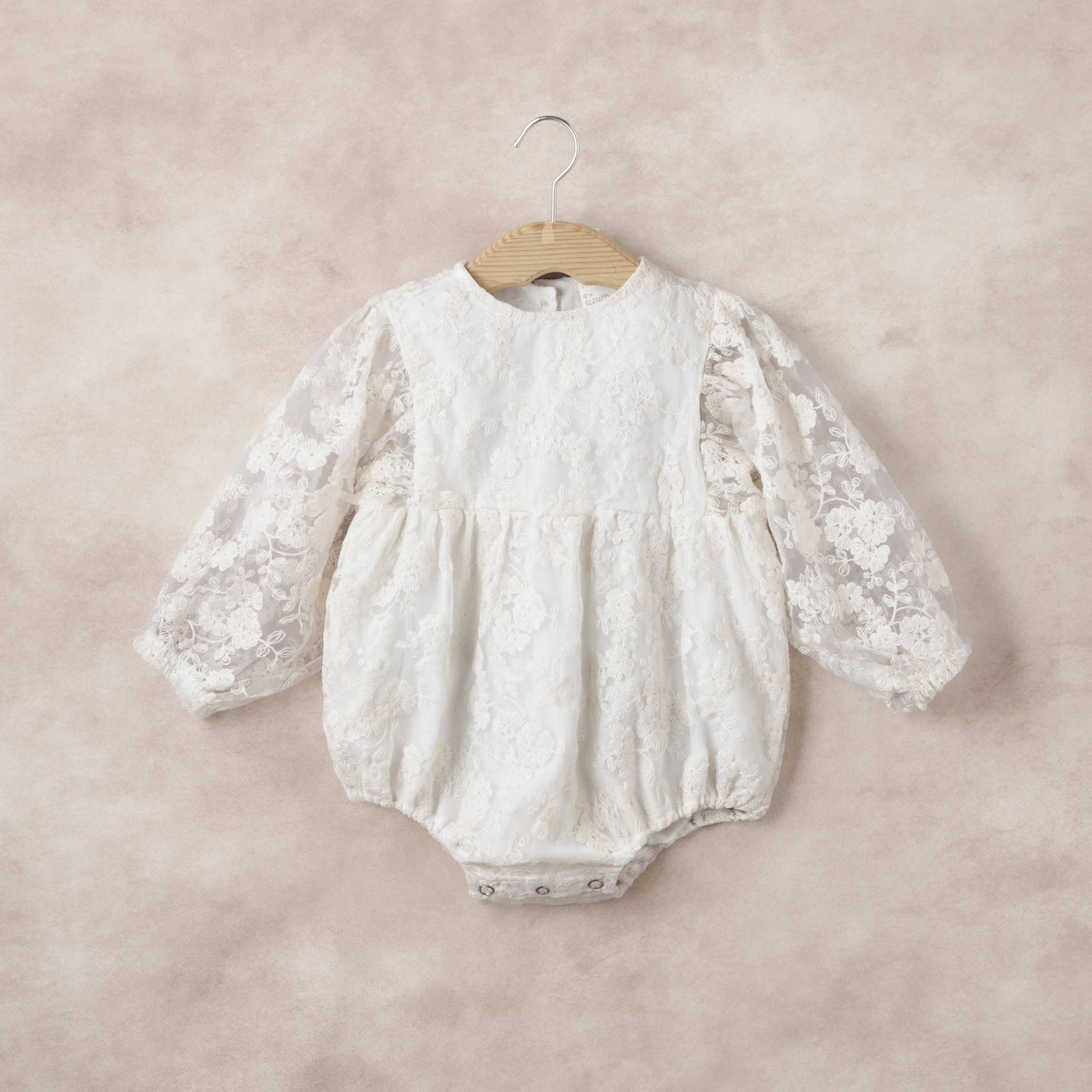 This elegant baby romper features a sheer embroidered organza overlay in soft ivory, creating a timeless silhouette perfect for special occasions. Designed with long sleeves and elastic cuffs for comfort and charm, it fastens with back buttons and snaps underneath for easy changes. A delicate, heirloom-worthy piece made for picture-perfect moments. From Truffles Ruffles Capsule Collection featuring exquisite styles for girls 0-6.