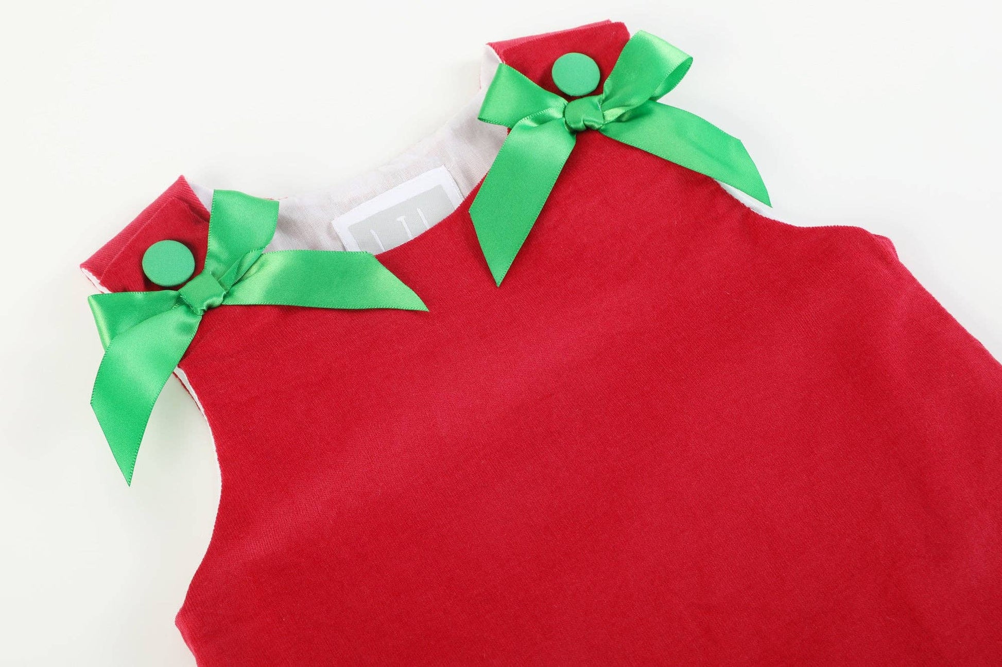 Dress up in holiday delight with our Red Corduroy Christmas Applique Bow Dress! Detailed with cute bows at the shoulders and featuring an adorable appliqué Christmas scene, this dress is the perfect blend of festive cheer. In merry red corduroy, it's the ideal outfit for your little one to twirl through joyful celebrations with a touch of Christmas cuteness.